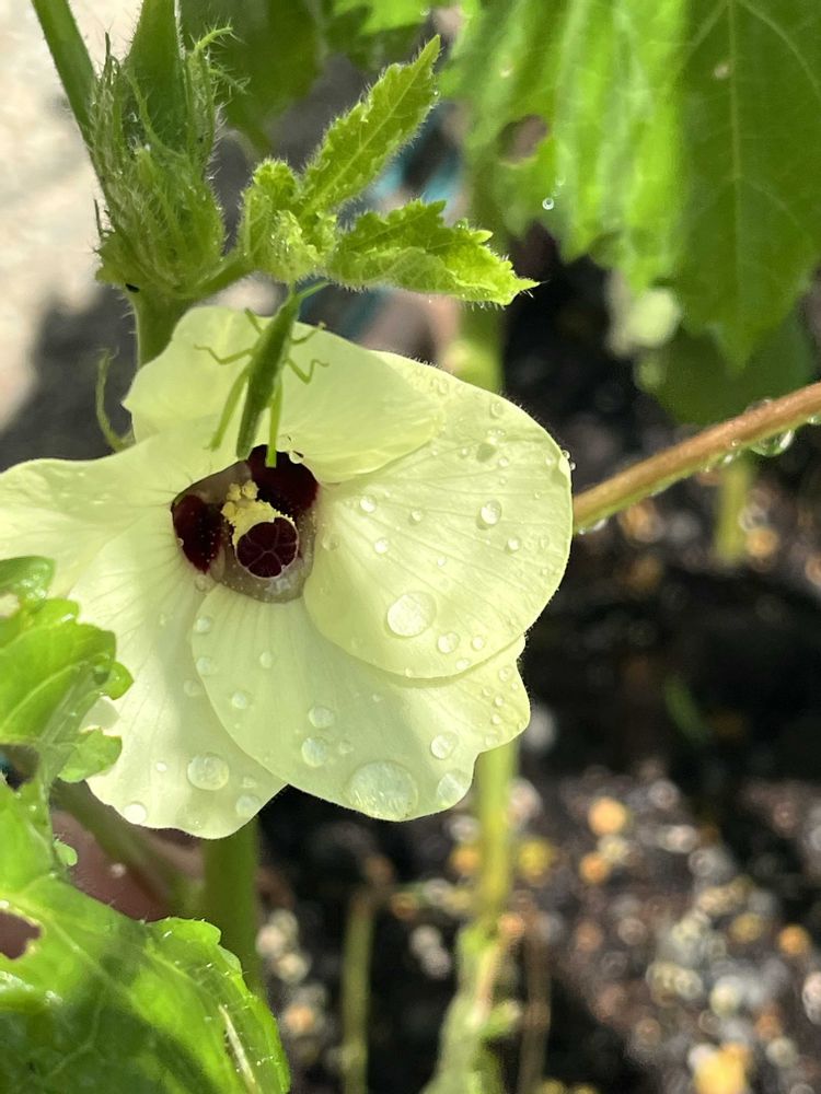 おはようございます。晴れ、29.9℃、9:50ムシっと暑い。早生オクラ54日目1番花が咲きました。ポインセチア2世花が咲きました。どちらの花にもバッタさんがご出勤中です。🥰😍😻😸😋☺️