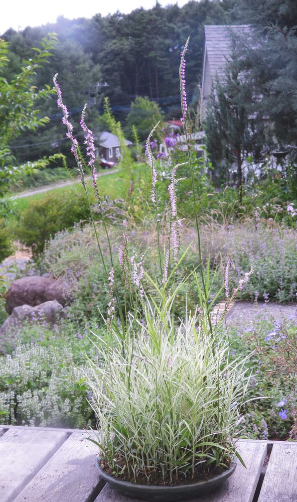 涼しげなグラスと伸びやかなネジバナが素敵で、品評会に出しても賞が取れる、と豪語する山野草専門店のお爺様
