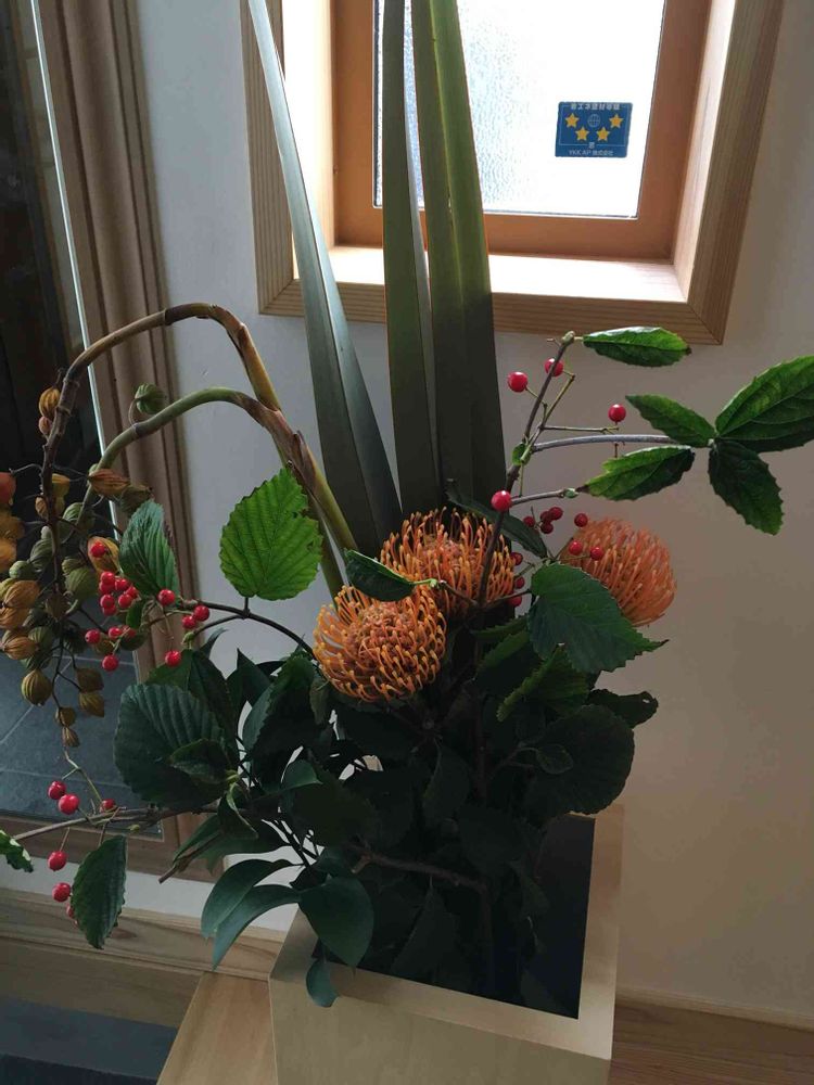憧れの花屋さんに行ってきました。リクエストは、秋のイメージで、ピンクッションと「赤」を使うこと。モダンな和の香り漂うアレンジとなりました。