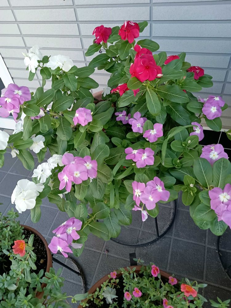 ジム帰りに見かけたお店のお花、ニチニチソウ〜元気に咲いています✨️🩷🤍❤♡˖꒰ᵕ༚ᵕ⑅꒱