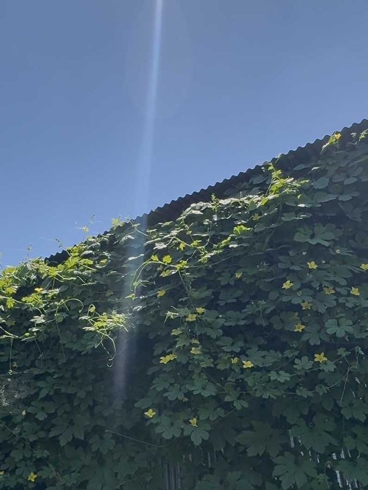 夫と私の2人で10年程前に建てたトタン小屋の3面に、今年初めてゴーヤとキュウリとアサガオの蔓を這わせてみた。(夫が💦)