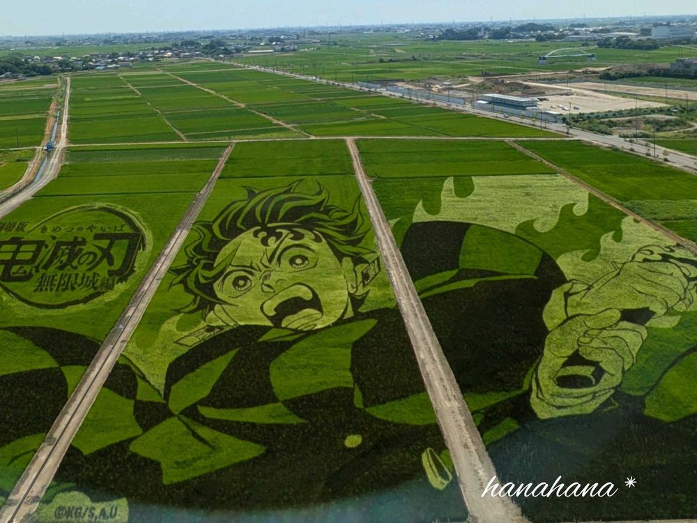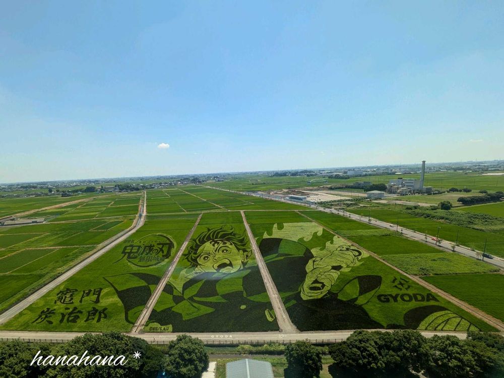 主人公「竈門炭治郎」が描かれています。高さ50mの行田タワー展望室から見る田んぼアートは迫力満点でした💯