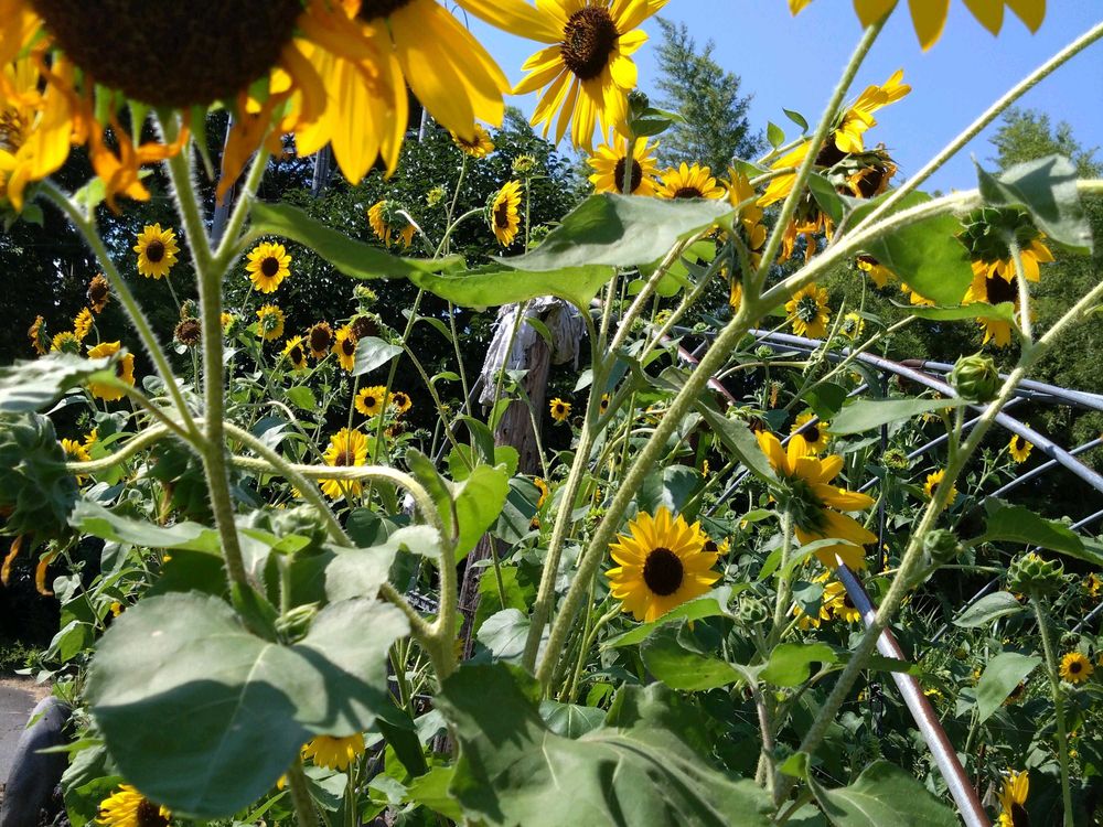 ②家の前の畑のビニールハウスの周りはひまわりに覆われてました