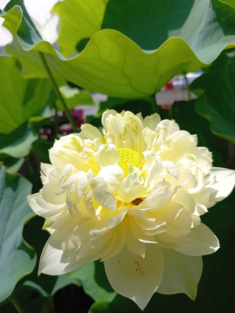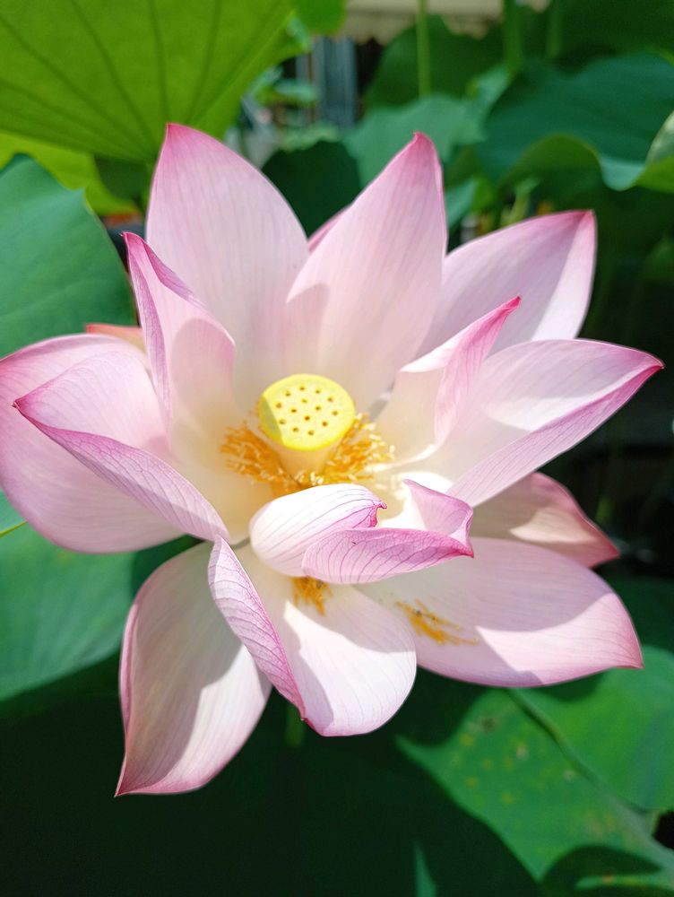 蓮は水の中の地中に塊茎を持ち、水面から1~2mほど伸びた茎の先に、青々とした大きな丸い葉を展開させ、葉の間から茎を伸ばして花を咲かせます。葉は直径30~50cmの大きな円形で、支えるように中心から葉柄が伸びています。