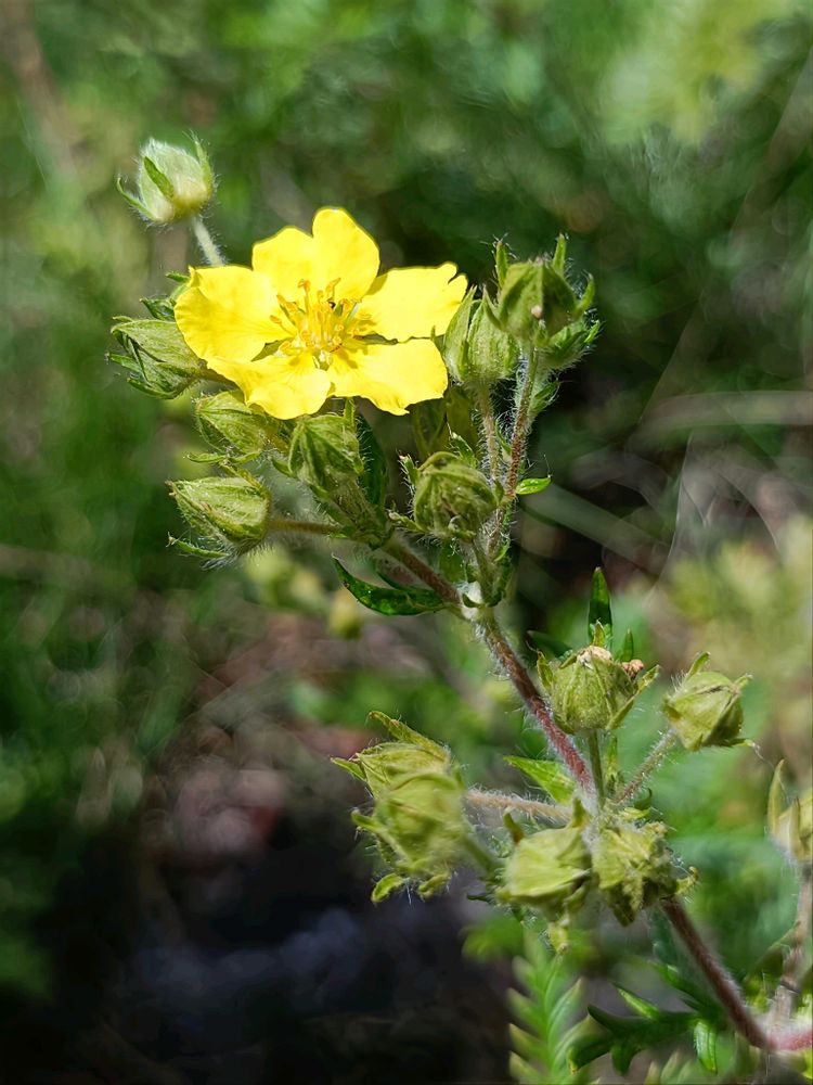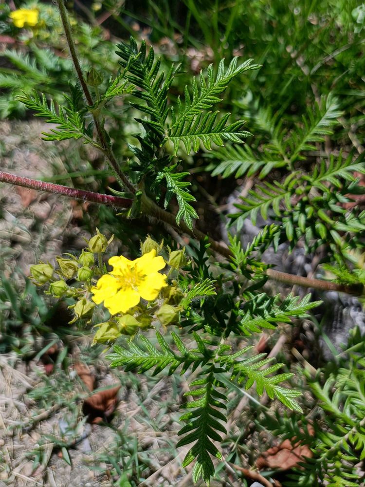 茎は根元で多数分岐して広がり、先が斜上する。葉は互生、小葉15~29個の奇数羽状複葉。小葉は羽状に深裂。茎の先に直径10~15㎜の黄色の5弁花をつける。長い花柄がある。萼片には短毛が生え、緑色。