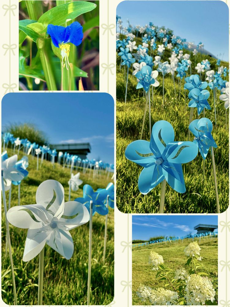 無数の風車💙🤍が彩るメルヘンな世界はまるで絵本の中に迷い込んだよう!…訪れたときは白と水色の爽やかな風車でしたが、季節によって色合いも少しずつ変化します。