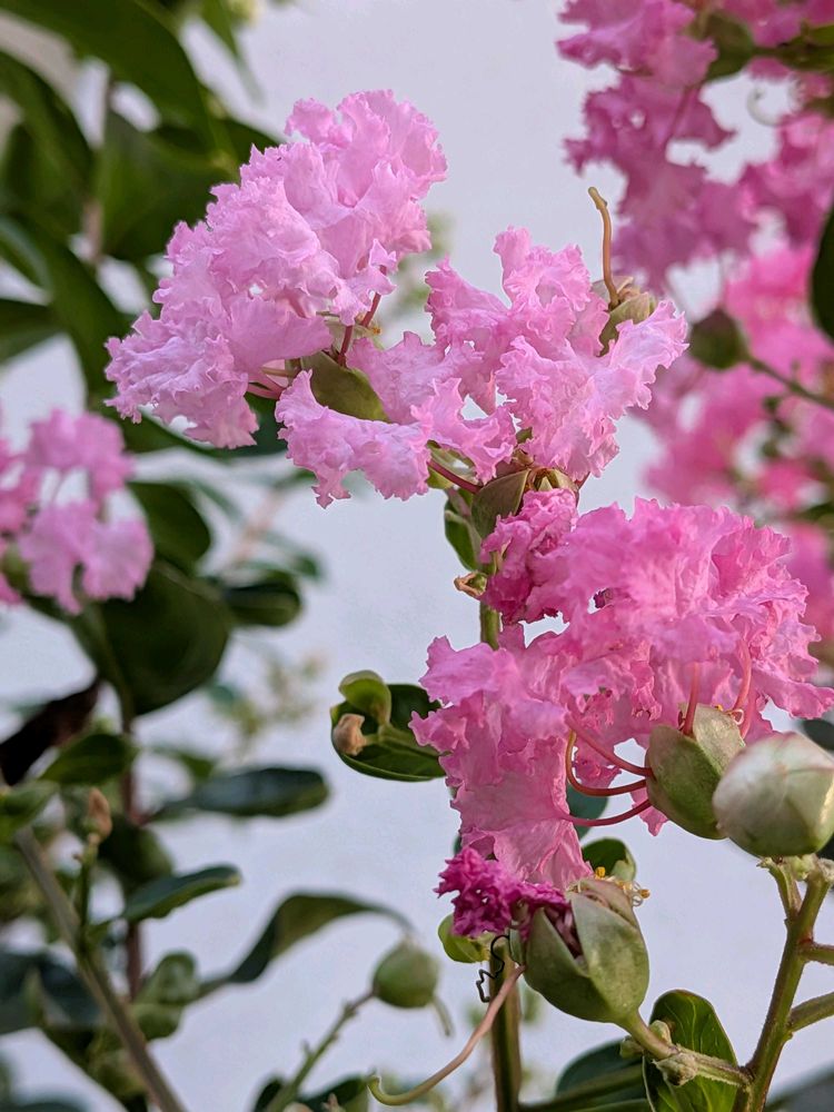 真夏の花サルスベリさんが太陽の光を浴びて赤やピンクに輝いています