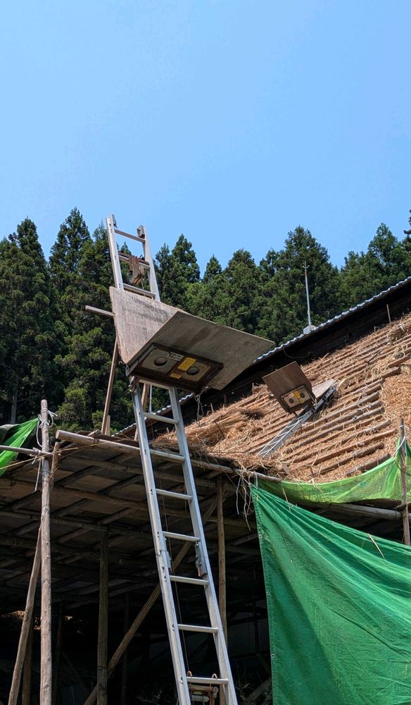 暑い中、足場を組んで上られていますが、茅は手じゃなくて機械で上げておられました!