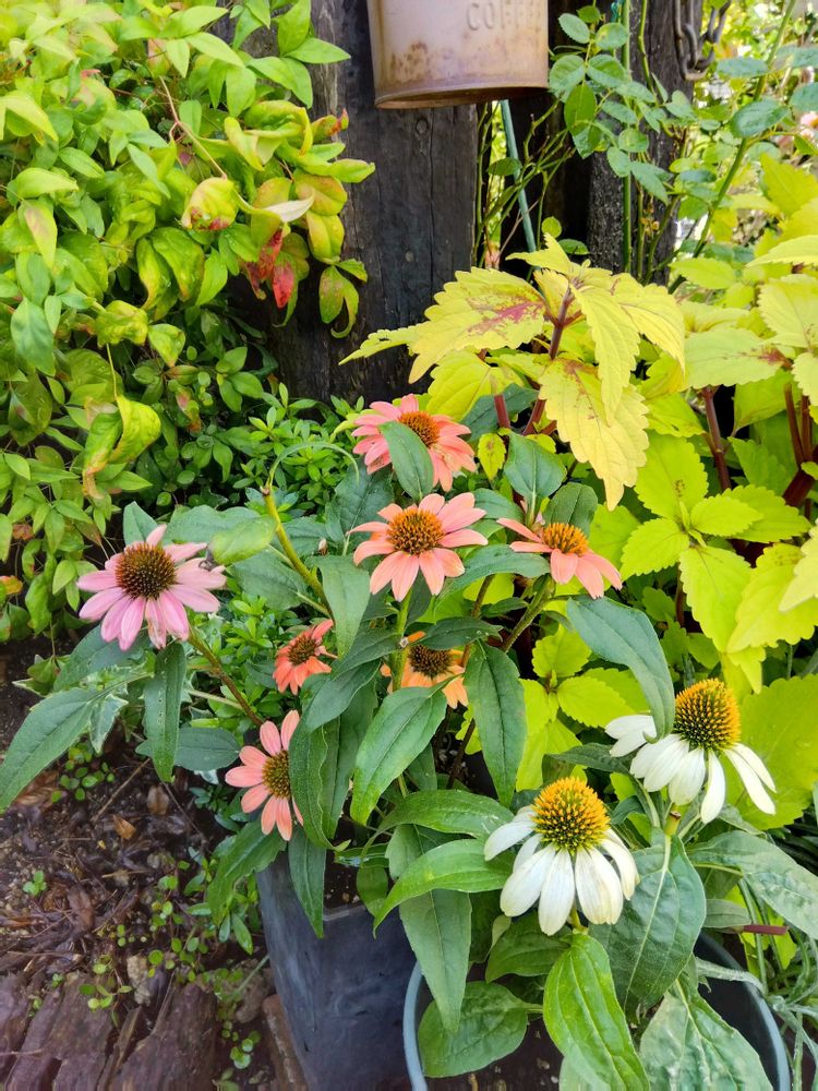 ①エキナセアをお一人様で鉢植えにしています🩷🧡🤍