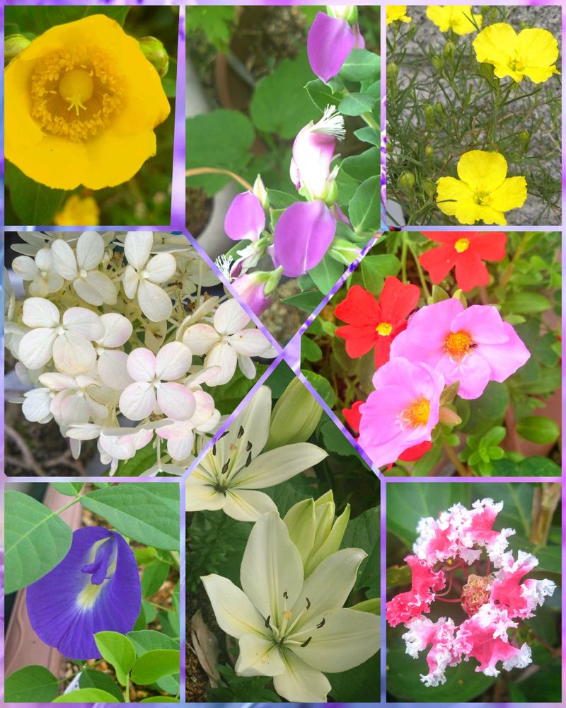 左上から時計回りに、まだ咲く金糸梅、ポリガラ、サニーチャーブ、ポーチュカとサンブリテニア、サルスベリ、スカシユリ、バタフライピー、ノリウツギです🌿🌸🍀🏵️🌿