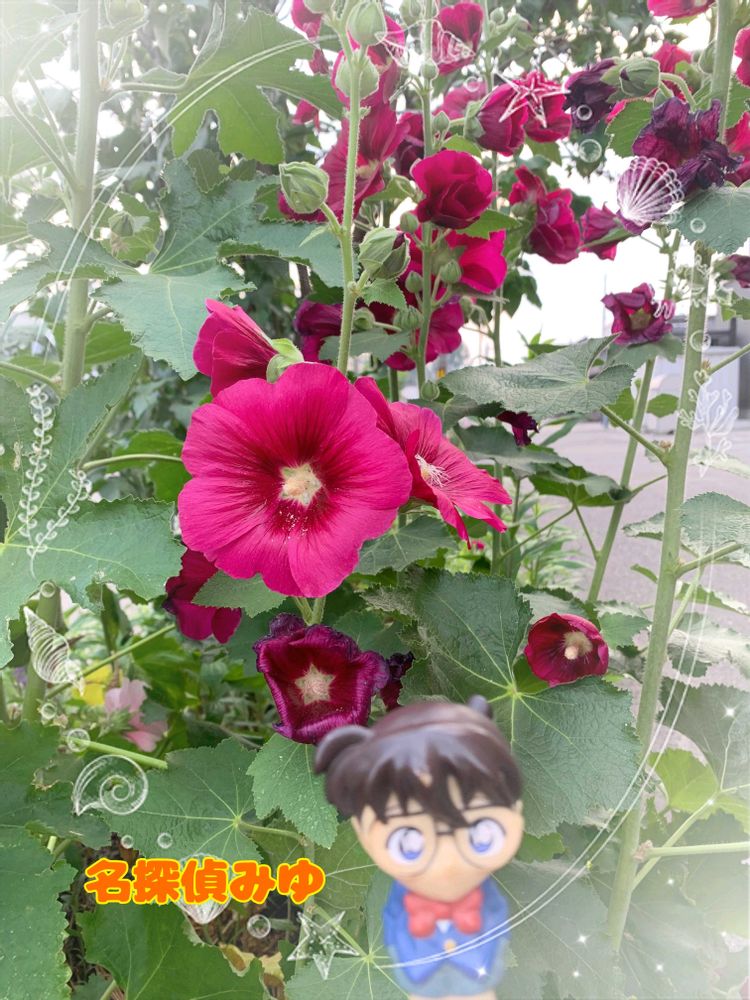 タチアオイのドラマチックカラーもぴったりコナン君😄💐🎇