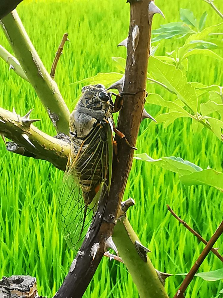 ミンミン蝉と薔薇の棘、バックに稲🌿緑色 面白い絵ですね👀!