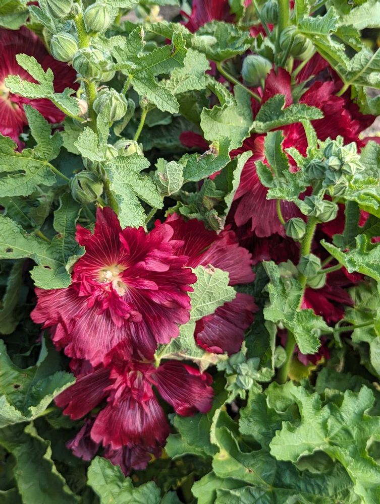 ⑤昨年6月1日、植物園にて撮影のシックなワインレッド色の八重咲きのタチアオイのお花🤳