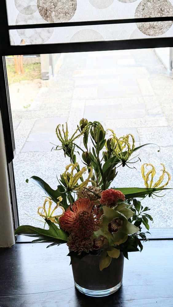 カフェのお花(グロリオサ、ピンクッション、逆光で暗くなってしまいました)