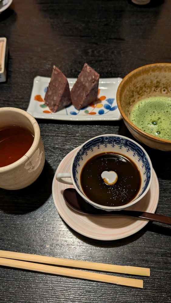 デザート(手作りのコーヒーゼリー、蒸し羊羹、お抹茶)