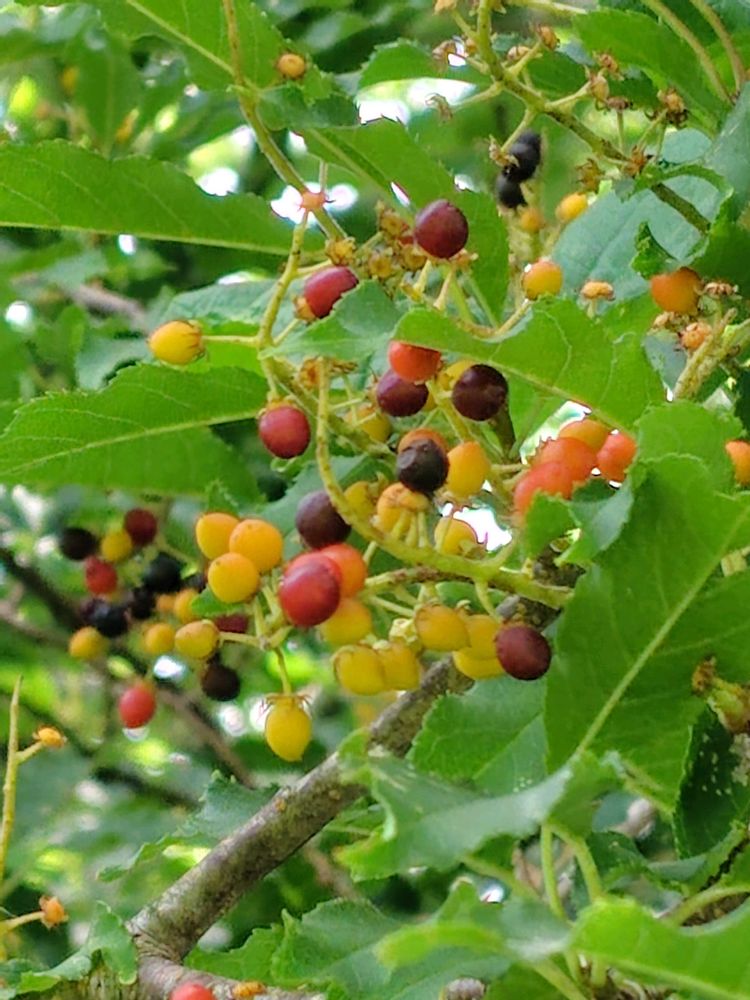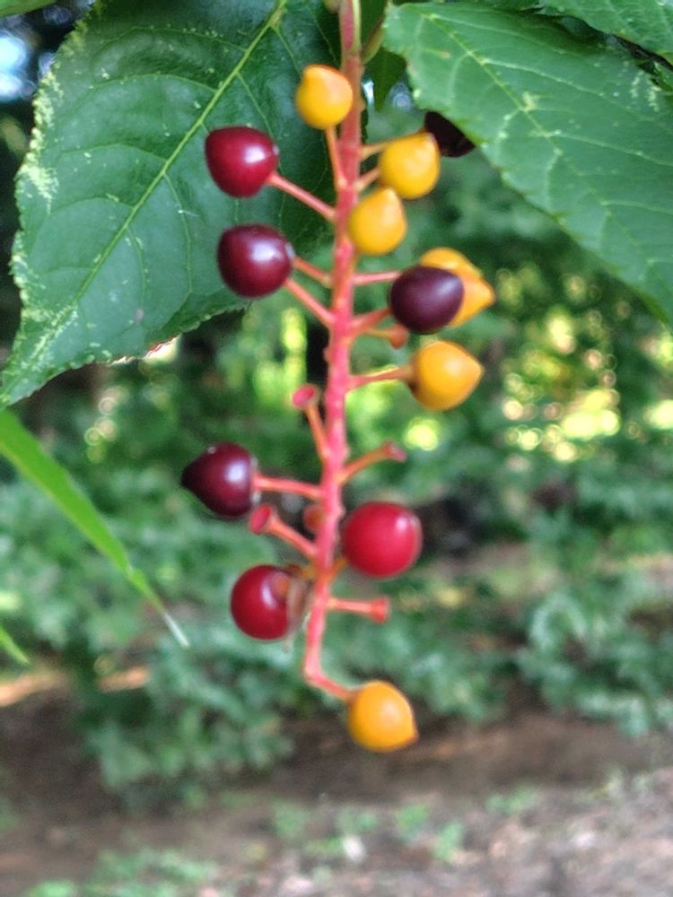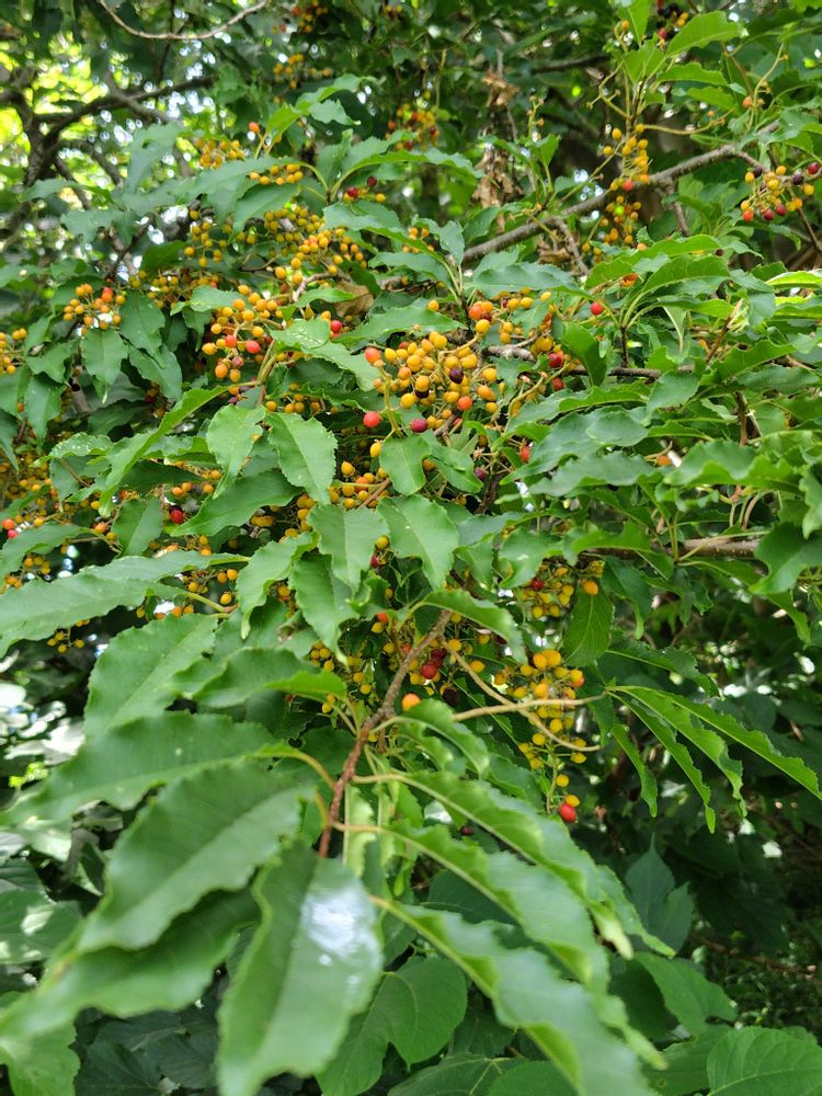 花が終わるとできる緑色の果実は、直径6〜7mmの卵円形の核果で、熟すに従って黄色→橙色→赤色→黒色に変化していく。