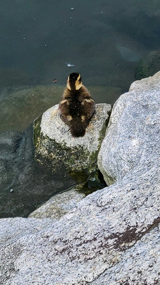 5️⃣親鳥とはぐれて石の上で羽を休める子ガモ。🐤💧