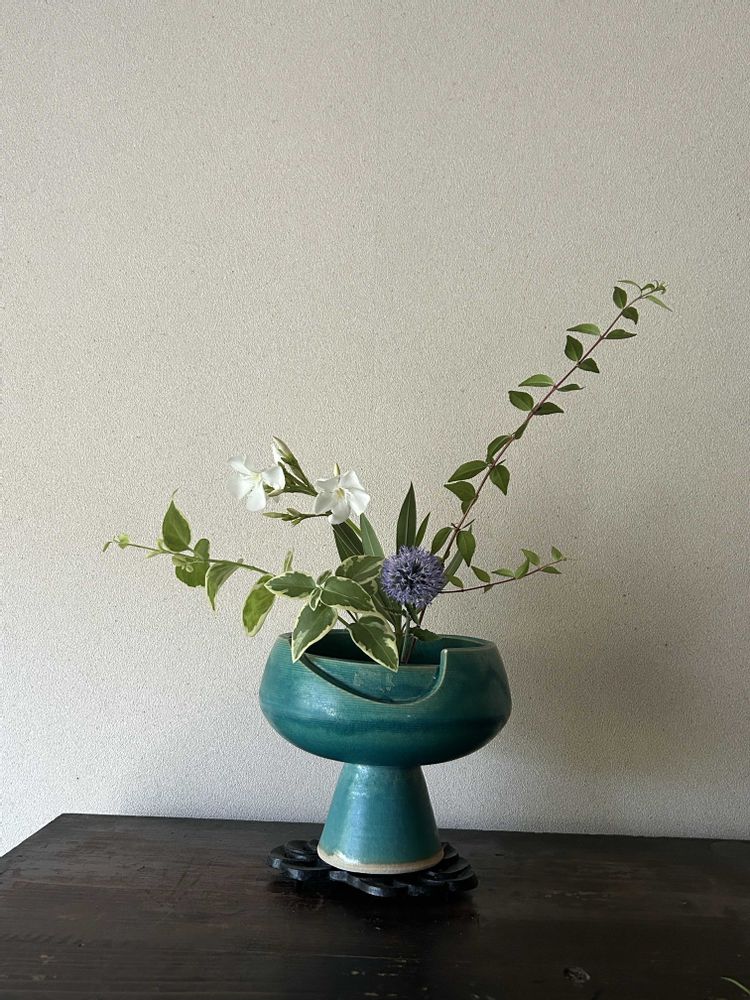 ユニークなデザインの器。色もいいですね。パッと見たら、赤いダリアが似合いそう!と思いました😁