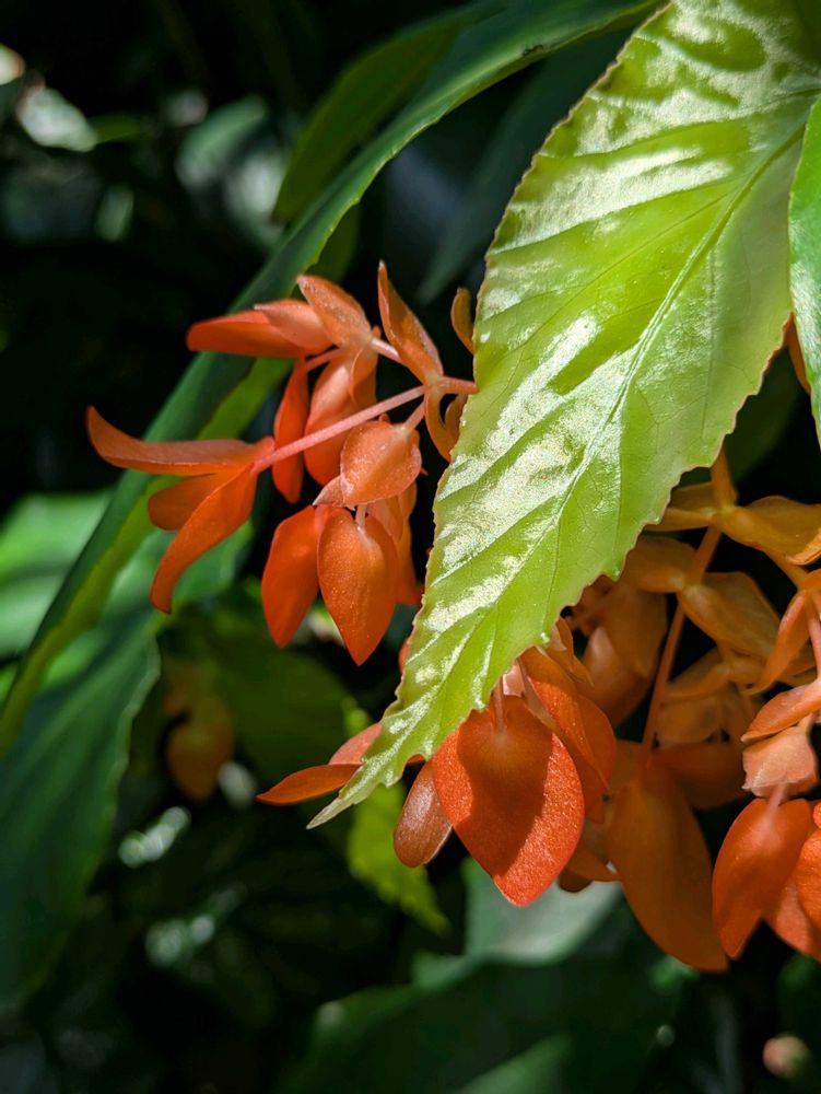 細長の黄緑色の鮮やかでテカテカした葉っぱで 鮮やかなオレンジ🧡色のお花が咲きます