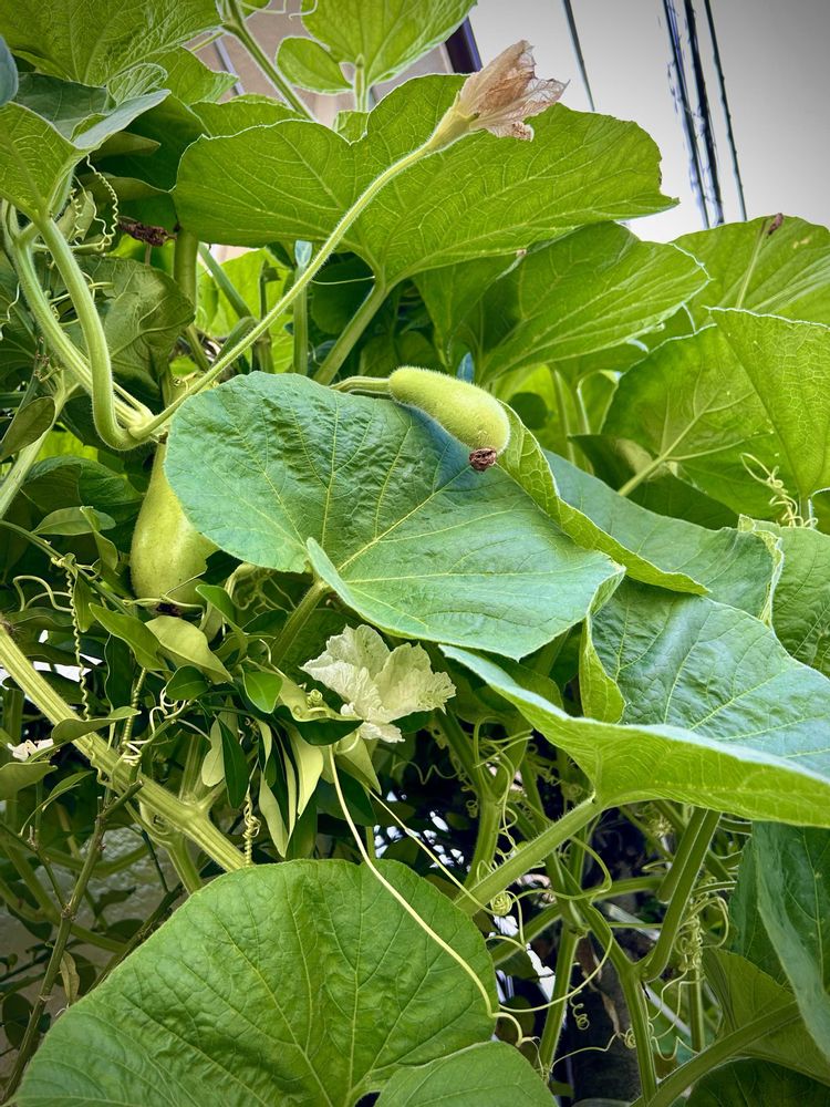 近所の極小戸建ての夏場のグリーンカーテンは毎年ユウガオです。大きな葉っぱと大きな実🍈が2階建ての南面を覆い尽くします。実の成長は早く、窓から収穫・・・気をつけて(*´︶`*)ノ