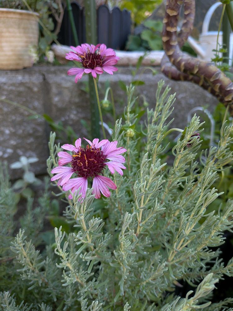 今朝庭🏡ラベンダーの葉っぱと、ガイラルディアグレープセンセーション。この組み合わせ可愛い✨