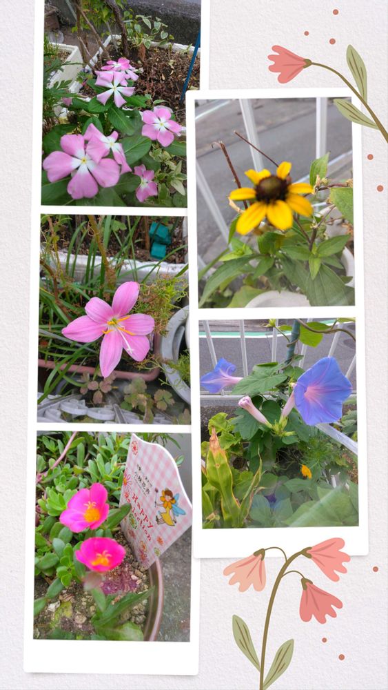 日々草、ゼフィランサス、ポーチュラカ、ルドベキアタカオ、琉球朝顔
