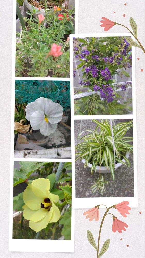 ミマツヨイグサ、パンジー、オクラダビデの星、デュランタ宝塚、オリヅルラン