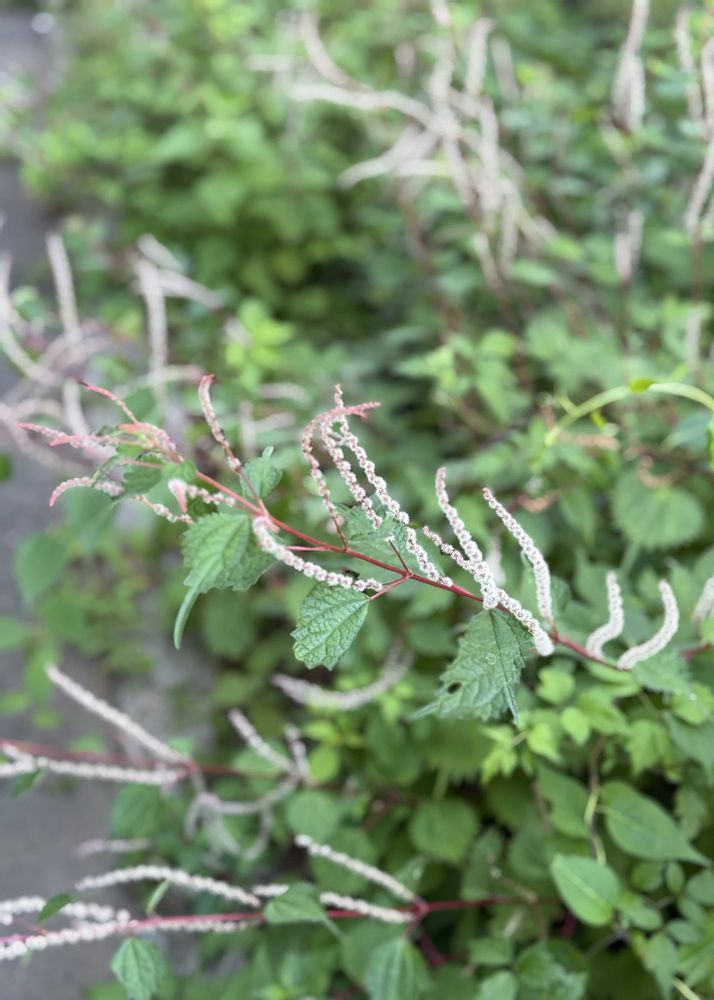 シソのような葉っぱ、茎は赤い🩷