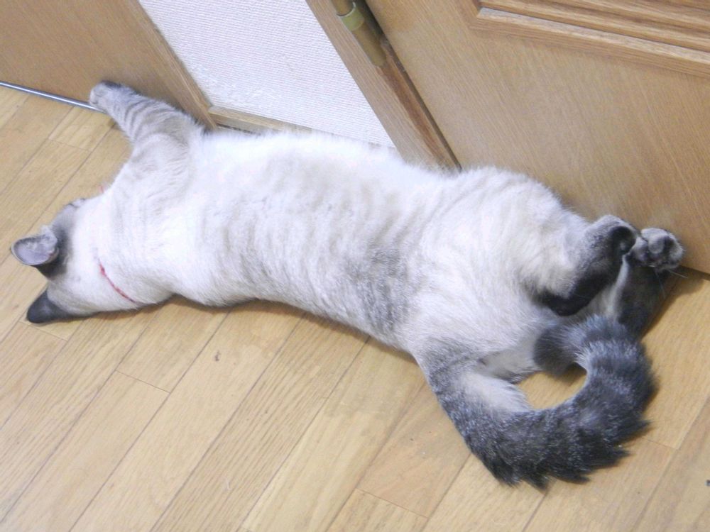 でも、寝方が違っています。ドアの下から風が来て涼しいので、トイレや洗面所の前に陣取るので困ります🤣️🤣️🤣️