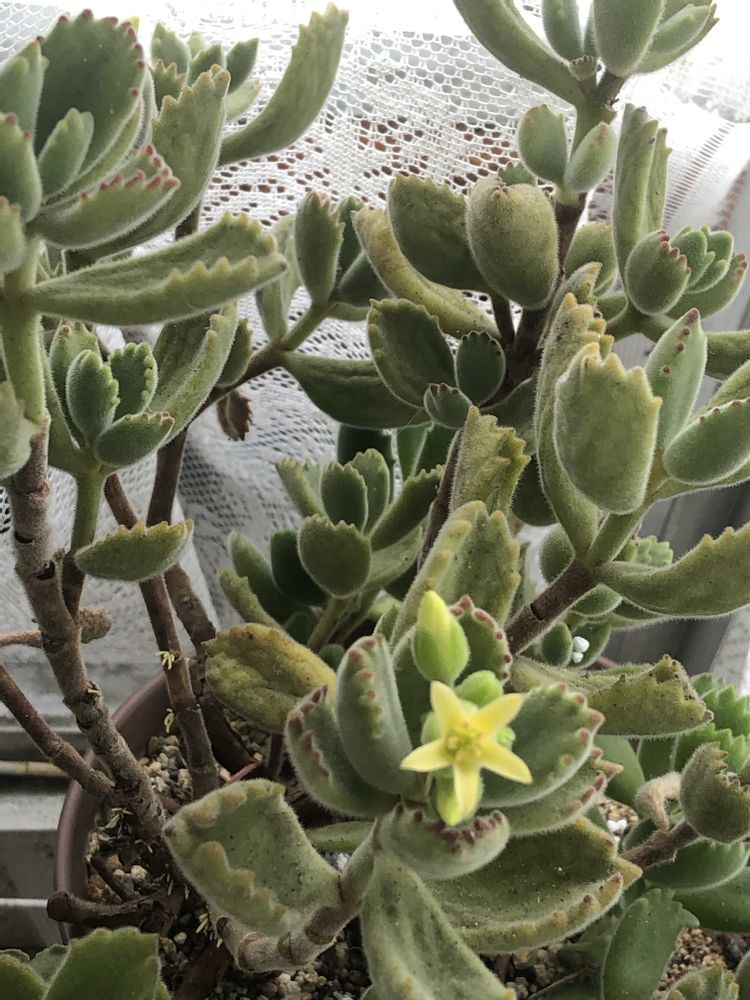 水やりしても葉が太らないな〜って枝に花芽がつきました。あれ?年末にも咲いてたのに。熊童子の開花期っていつでしょ?