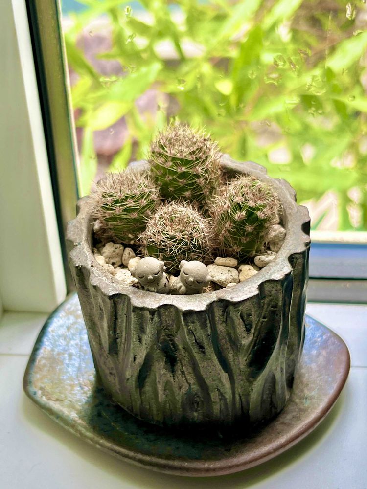 笠間焼きの盆栽鉢。紅葉を枯らしてしまったのでサボテンを入れてみた。