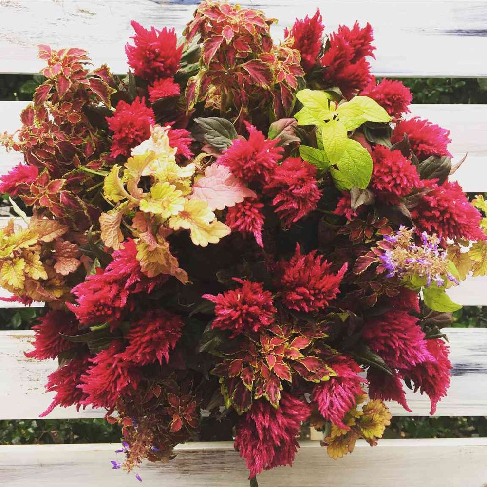 赤いセロシアとプチタイプのコリウスでハンギングバスケットを作りました。