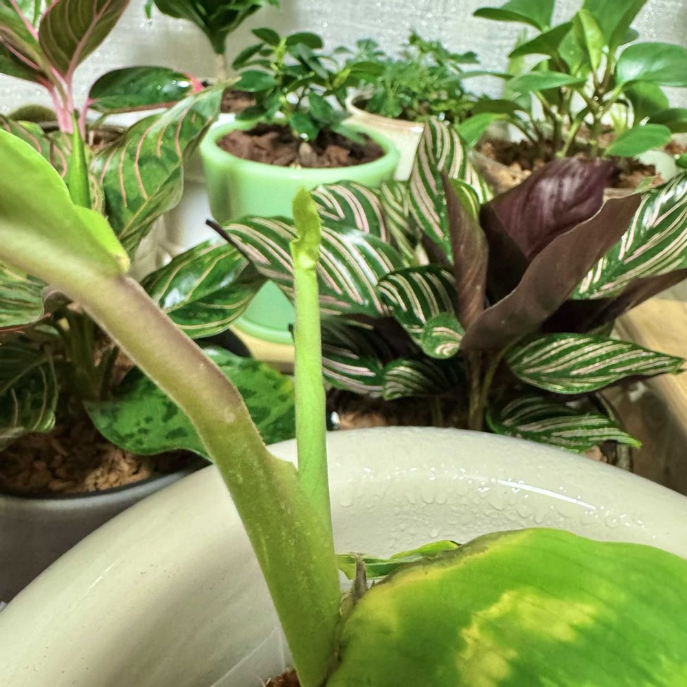 うっかり直射日光に当ててしまったカラテアに新芽が出てきた。