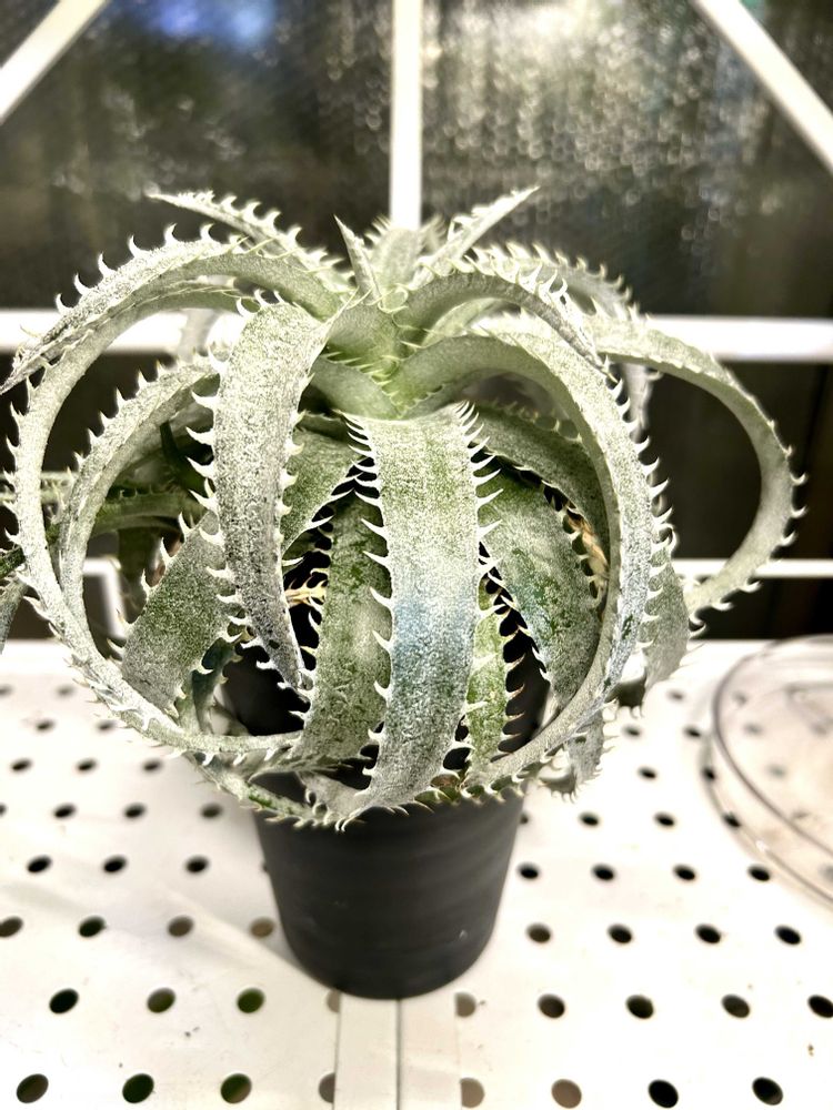 細長い葉がロゼットを形成し、シルバーグリーンの葉色と白いトゲが美しい品種です。比較的大きくなる傾向があります。