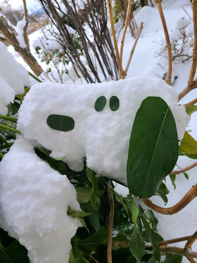 2023年の冬 玄関先のヤツデに積もった雪がスヌーピーに見えて 耳と目を付けて見ました🤭