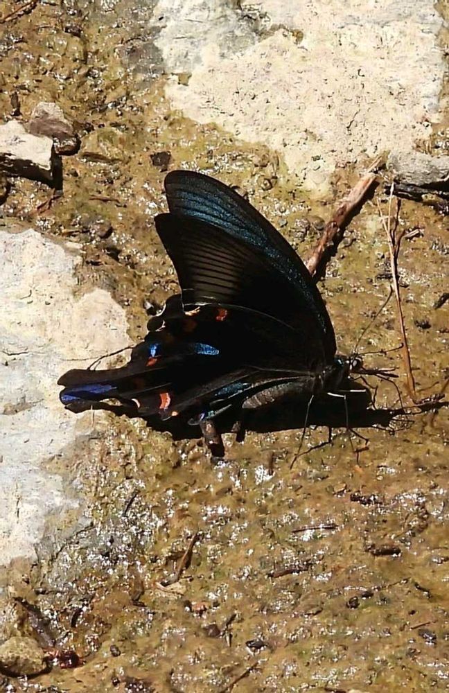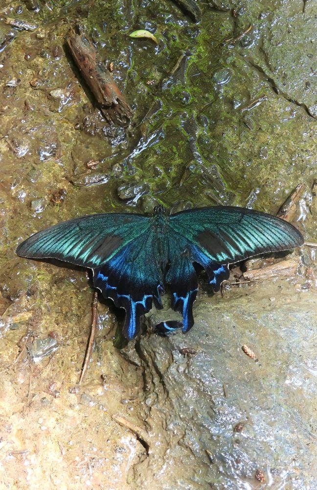 3️⃣4️⃣5️⃣ このジャコウソウの咲いている側の湧き水を吸いに、美しい瑠璃色のミヤマカラスアゲハ蝶が来ていました。