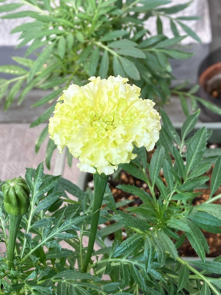 マリーゴールドのホワイトゴールドマックスが咲きました。種まきから2カ月半ほど。まだ黄色味が強いです。
