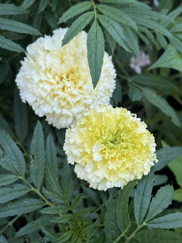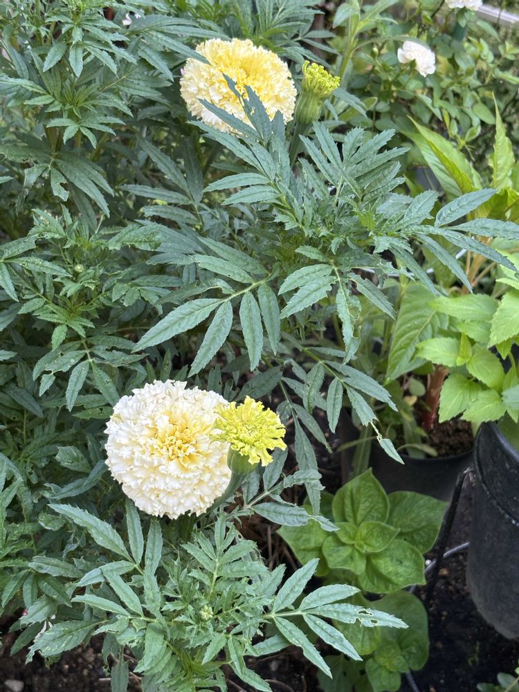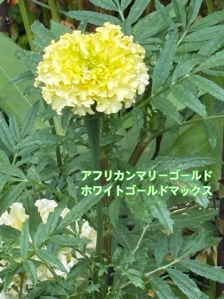 ネットで購入したマリーゴールド(ラベルにはホワイトゴールドマックスと名前)は、普通のマリーゴールドより花も丈も大きく、ホワイトゴールドの色合(私はライムグリーンに見える)が素敵✨