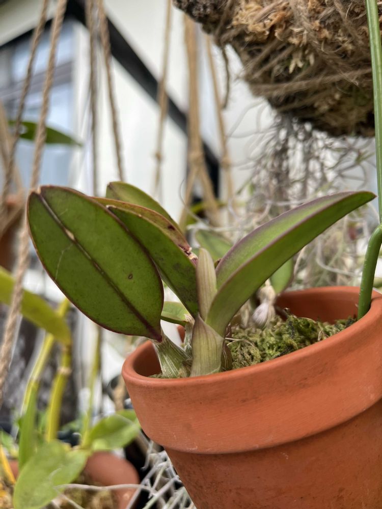 ④カトレアミレリー22年から殆ど変化無し、一緒に来たテトラゴナム、オマケのカトレアは毎年咲いてくれるのに‥葉っぱの中から出てるのは花芽?期待して良いのかなぁ?