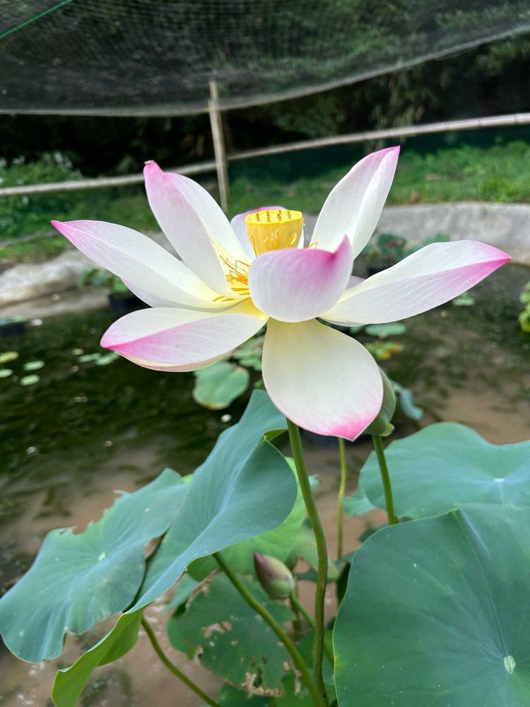 8月2日、北九州市若松区小石惣牟田、石峰山麓の池に茶碗蓮を植え付けている私的公園。