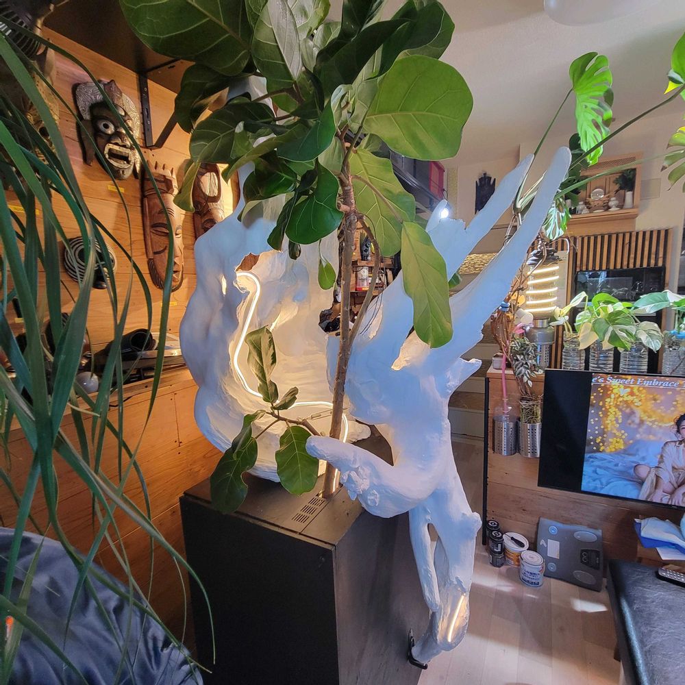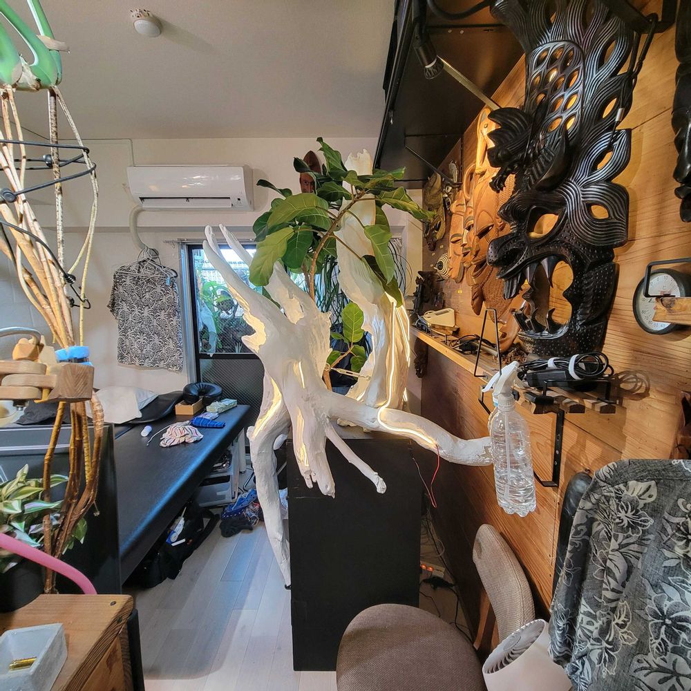 流木、水性塗料、ゴムの木(アフリカン・プリンス)
