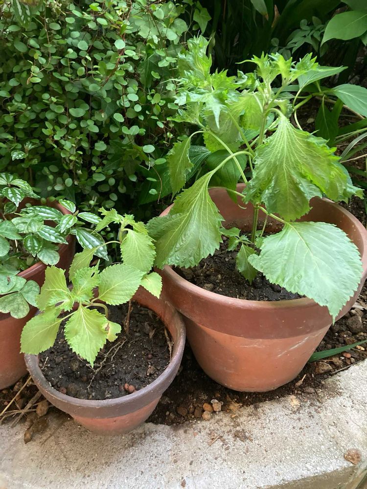 うちの畑の青じそを土ごとスコップですくって実家へ持って行きました。2つの鉢に植えました。元気に育っています。大葉はよくお料理に使います。食べる時いい香りです。