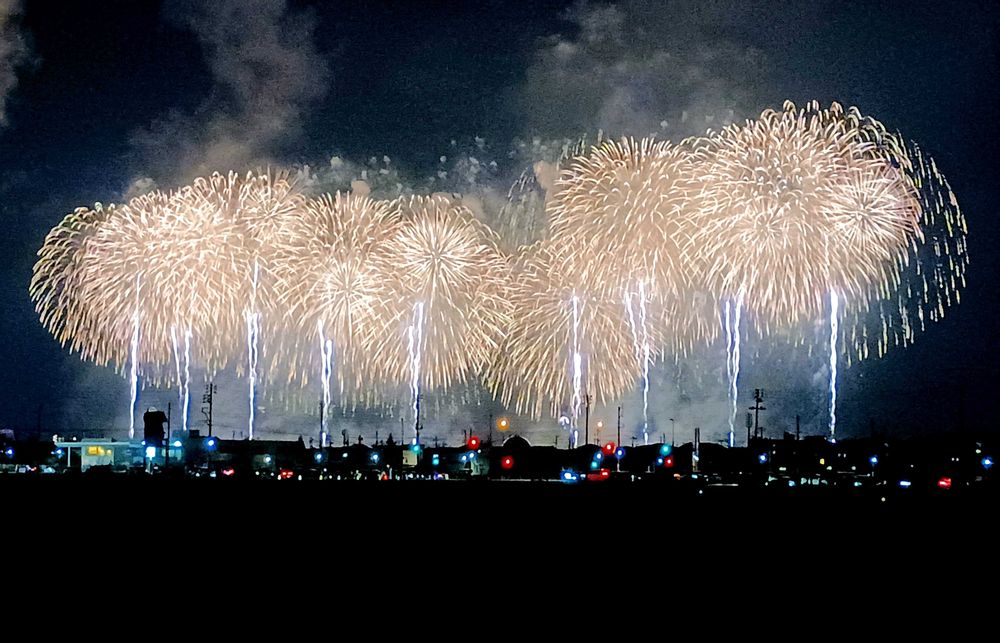 ちょっと斜め位置なので少し短く見えてますが、左右端から端まで2km幅の大花火です🎆🎆🎆🎆🎆