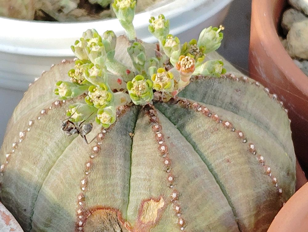 ①オベサの雌花が次々と咲いて3つは受粉完了! 種の破裂いつなのか分からず、飛び散ったら種は見つかりません!