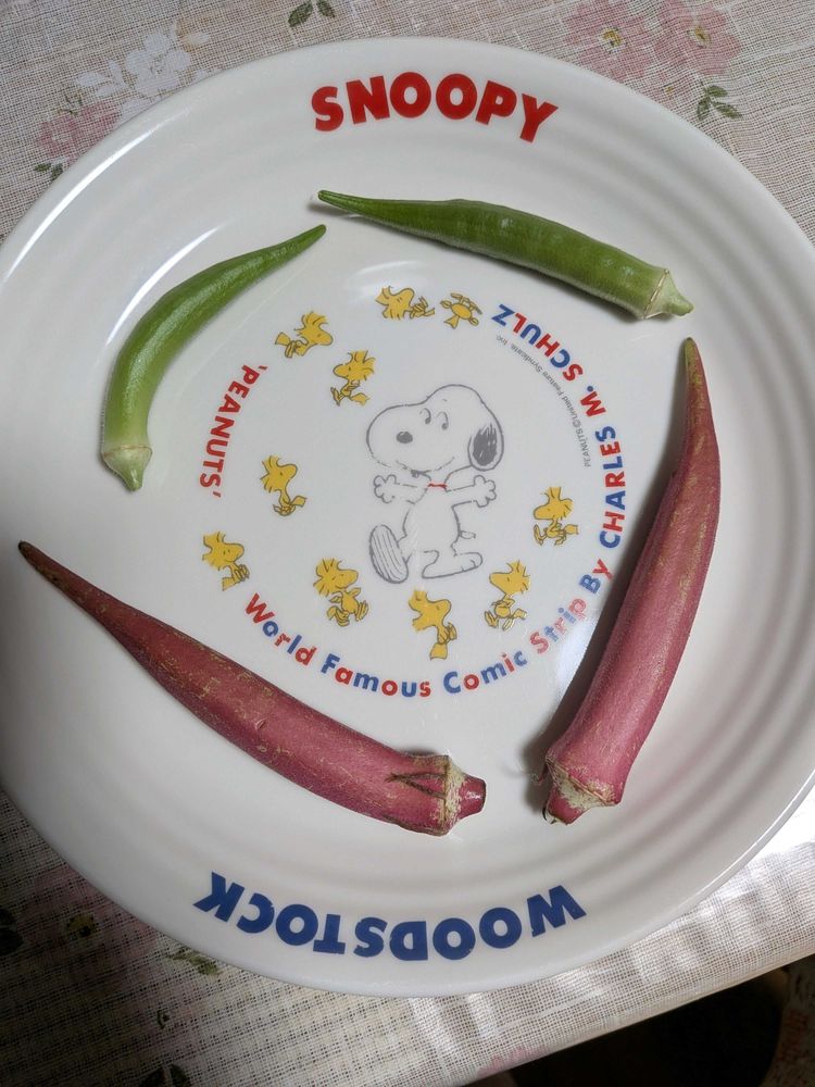 💚緑のオクラは我が家でプランターで育てたのを夕方収穫😊 🩷はスーパーで購入🛒