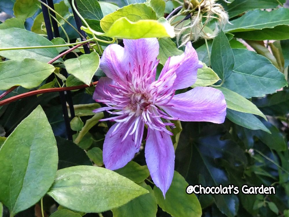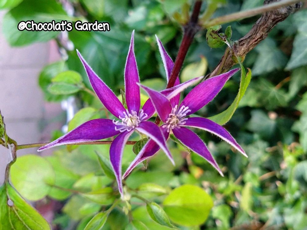 ①大輪の一重の紫のクレマチス… のはずがめっちゃ小さくて細い花弁のお花が次々と咲いています