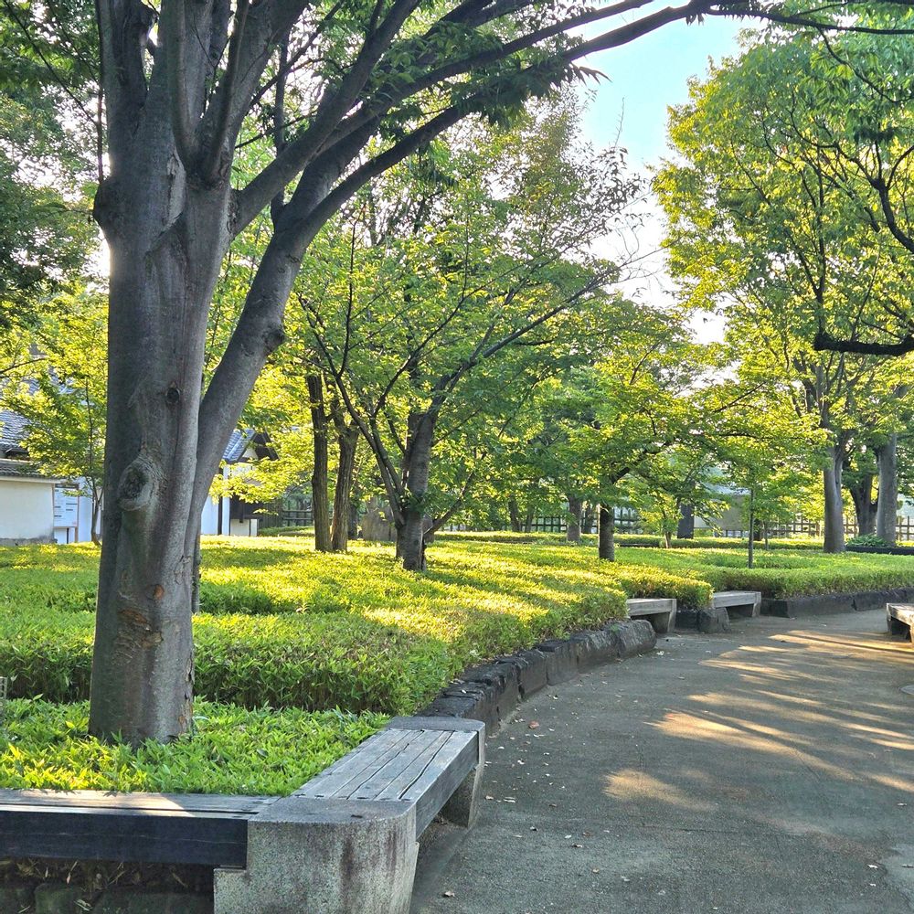 好古園の入り口のベンチタイム。蝉の声聞きながら、のんびり水分補給、良いですね💕