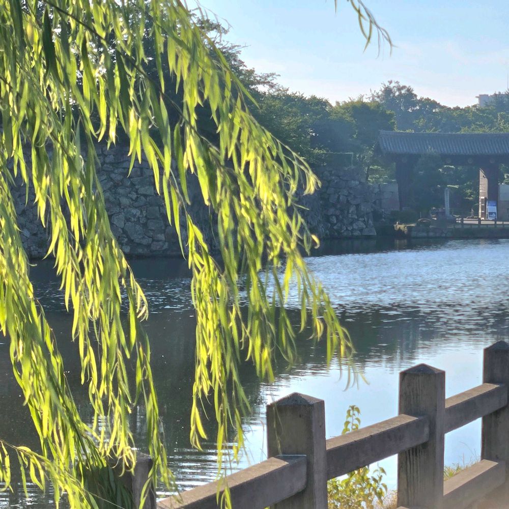 好古園の小径、国宝姫路城とさくら門橋、濠の柳の緑、朝の空気に包まれて、真夏だということも忘れてしまいます。