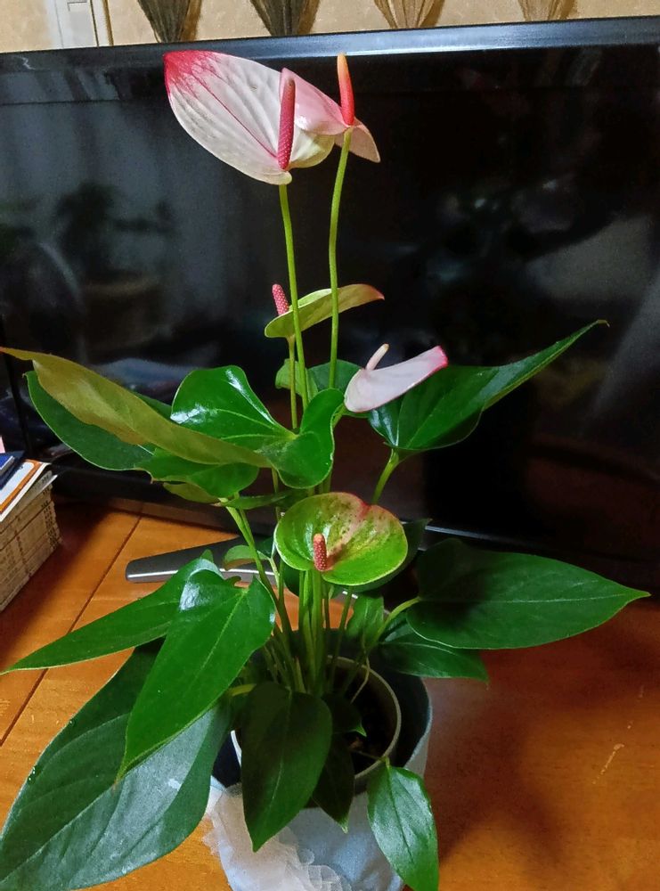 暑い北向の部屋にいますが、アンスリウムリリーって薄いピンクの子もいて、この子は根詰まりしてるようなので鉢を植え替えてあげる予定です💗🪴💗