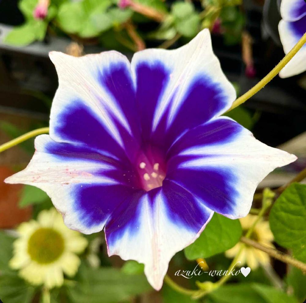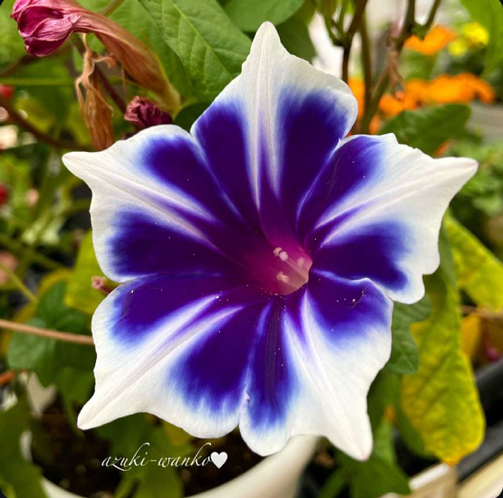 色鮮やかなブルーに白が入るとっても美しい朝顔で、出雲朝顔と言う品種です。